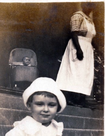 Although there may be other photos of Bessie, this is the only one in my possession. The baby in the wicker carriage is my aunt Martha, the toddler in the foreground is my father Andrew, and Bessie is the “Hidden Figure” in the upper right corner.